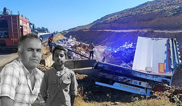 Hatay’da meydana gelen elim bir trafik kazasında, sürücüsünün direksiyon hakimiyetini kaybettiği gübre yüklü tır devrilerek alev aldı. Feci kazada, tır sürücüsü baba ile 13 yaşındaki oğlu olay yerinde hayatını kaybetti.